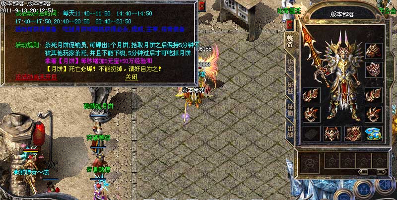 激情抢月饼活动:每天晚举行四场,全服玩家都可以参加!杀死月饼促销员可得到月饼。吃掉月饼可获得终极装备