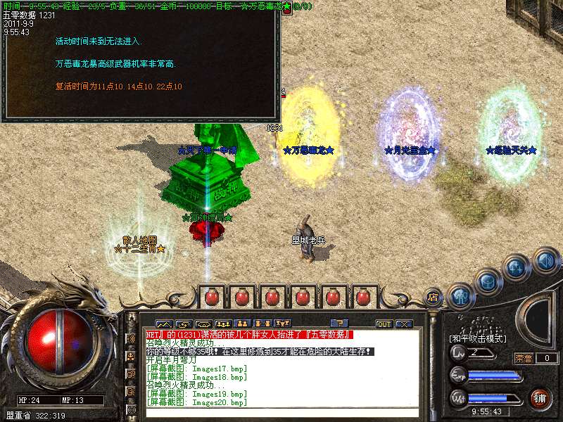 ★★万恶毒龙:系统每天的14点30和23:00开放二次万恶毒龙送开天活动,全服挑战参与,此BOSS防非常高,需要众人才能消灭,暴开天类机率为1/2!★★