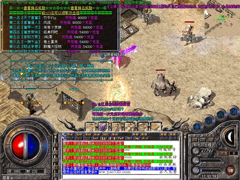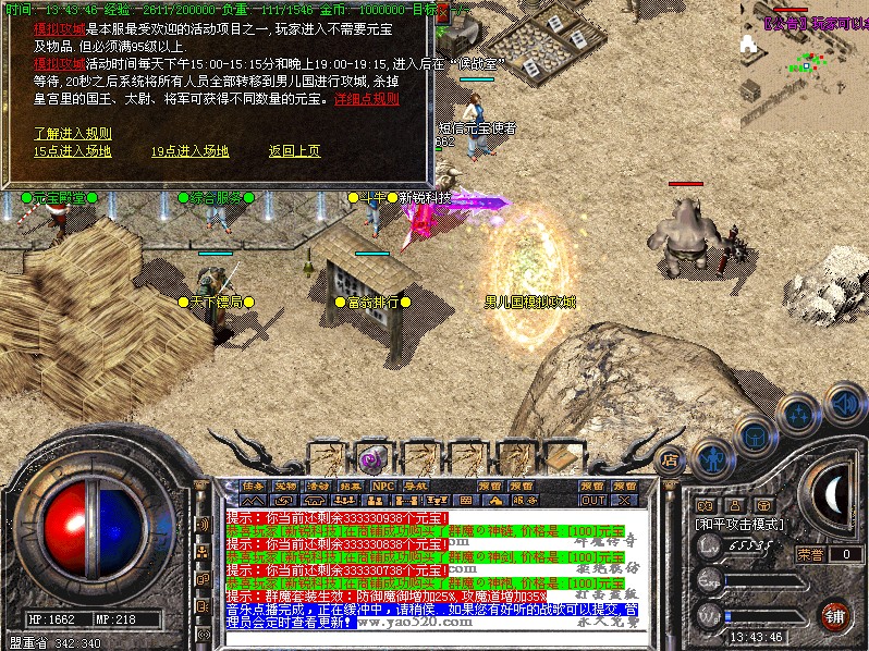 10.行会争霸每天15点,22点举行一次大型PK活动,获胜者,可以得到10000元宝,1亿经验!进入期间每秒可得15万经验