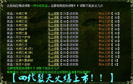 5.装备等级划分:裂天,光明,九天,江湖,风云,神逾,乾坤.残月.帝王 !