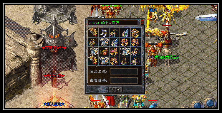 【元宝购物】:本服安全区外设有元宝交易员,有元宝的玩家可以去里面买到你想要的道具