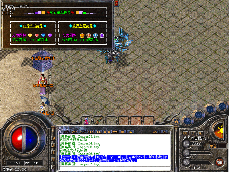 行会战场两小时举行一次,可以进去半个小时,每30秒增加100点荣誉值和300万经验,荣誉值可以直接换元宝。