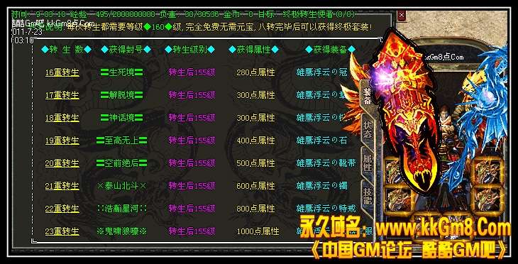 【更新】更新转生系统,1-15转,转生后每转都可以获得相应属性点,每转可获得强悍技能.详情请看转生仙子!