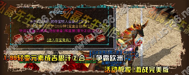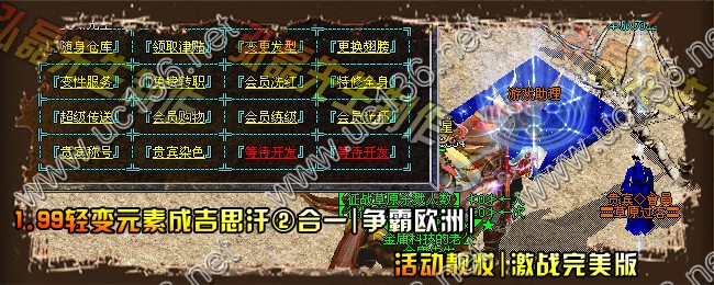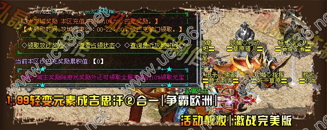【版本信息】:欢迎大家进入2011年07月最新火爆1.99轻变元素成吉思汗、争霸欧洲、活动靓妆、激战完美版, 功能最多 地图最多 美妙滋味 需玩家慢慢品味。。