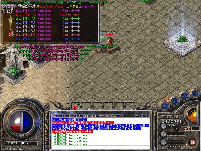 [每日活动]:服务器每天的0点(三倍经验)、15点(万兽入侵)、18点(无敌幸运星)、18点30分(PK之王争霸赛)、19点(摇钱树摇金元宝)、19点30分(行会争霸赛)、22点(魔殿-天降神机)、23点(墨攻-全区的人围攻终极BOOS)等活动,更多信息请点击土城中央的-[活动NPC]了解,建议千万别错过...