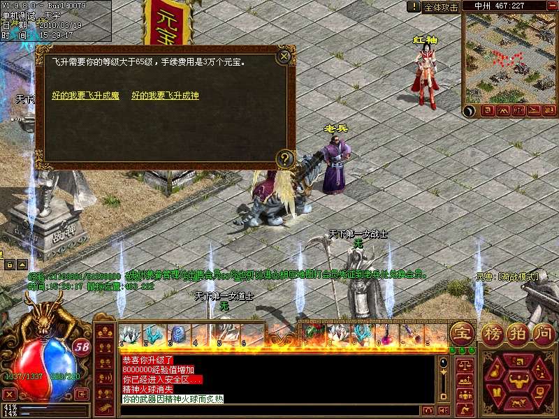1.实现天界飞升,天人重数显示,中州老兵可3万元宝快速飞升