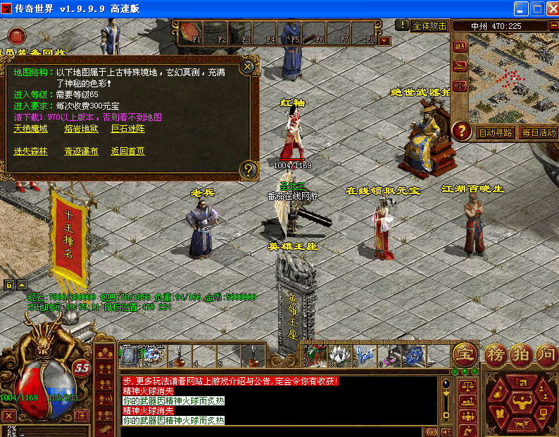 装备爆点:首先声明本服一切所有装备都能在各地图打到,爆出,天空之城爆神武级别装备,元神技能书,本游戏三大爆点:黑暗地狱,天魔宝藏,新开地图爆血煞,战神,新增暗神大厅天空,农民闯关轻松获得三神装备!练级可在会员练级地图,魔镜或天空打神武级别套装换经验卷等地图
