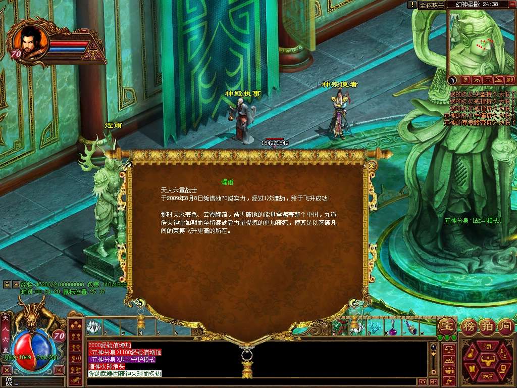 14 增加一个新地图-单身天堂 免费进入,大厅刷殿堂守护神 暴第二元神修炼用的修炼令牌 其余六层各 刷大小BOSS,经验丰富。免费玩家的新乐园