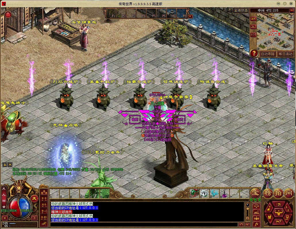 2,打宝:高级打宝(15分钟刷新小boss),帝王圣地(30分钟刷新boss)五大升级地图(30分钟刷新boss),可爆出天人晶核,大量元宝,积分,高级装备,高级物品。终极boss为千年帝王,玉皇大帝分别在帝王圣地2层,高级打宝刷出。可爆本服所有装备。