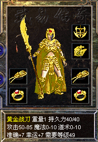 武器 黄金战刀 攻50-85魔0-10道0-10准确+7幸运+7 400 49
