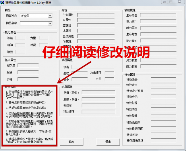 重点:修改所有东西记得全身的装备攻击属性累积不能超过1000点,否则会清零。