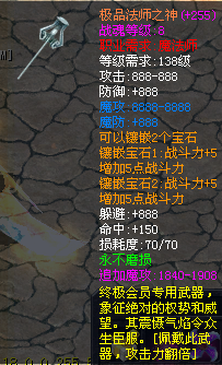 【游戏特色】 真正飞升成神,成神后属性加倍,等级提升,获得神之装备以及神专有光环以及免费使用神之聊天频道,至尊体现!