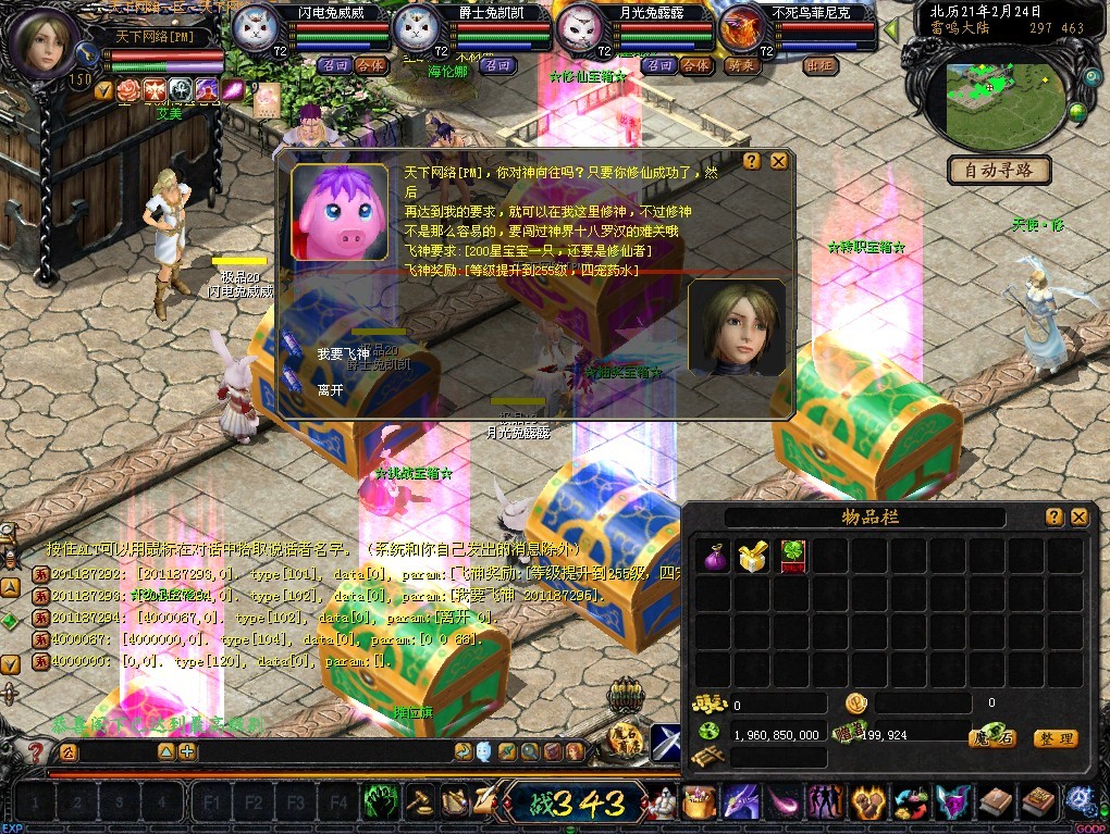 4:加入飞升成神任务,只要你身上有1只100星的宝宝一只,即可进入飞升成神挑战,奖励等级,加20终极装备一套!