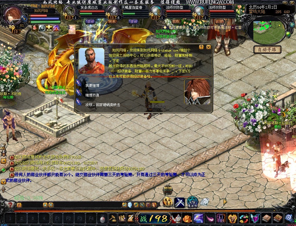 5、随身NPC增加御剑功能,宝宝幻化服务,赌博系统,领取会员工资功能,清洗PK值功能,免费复活宝宝功能,转职功能;
