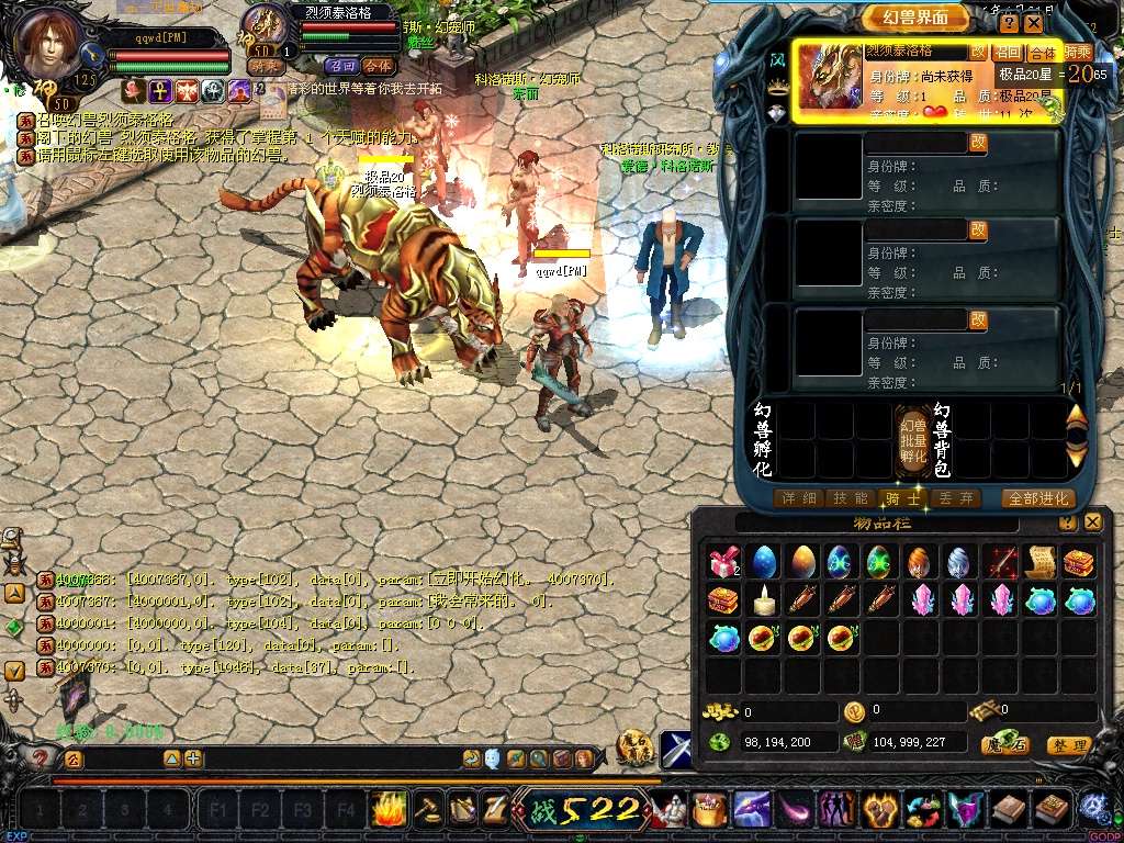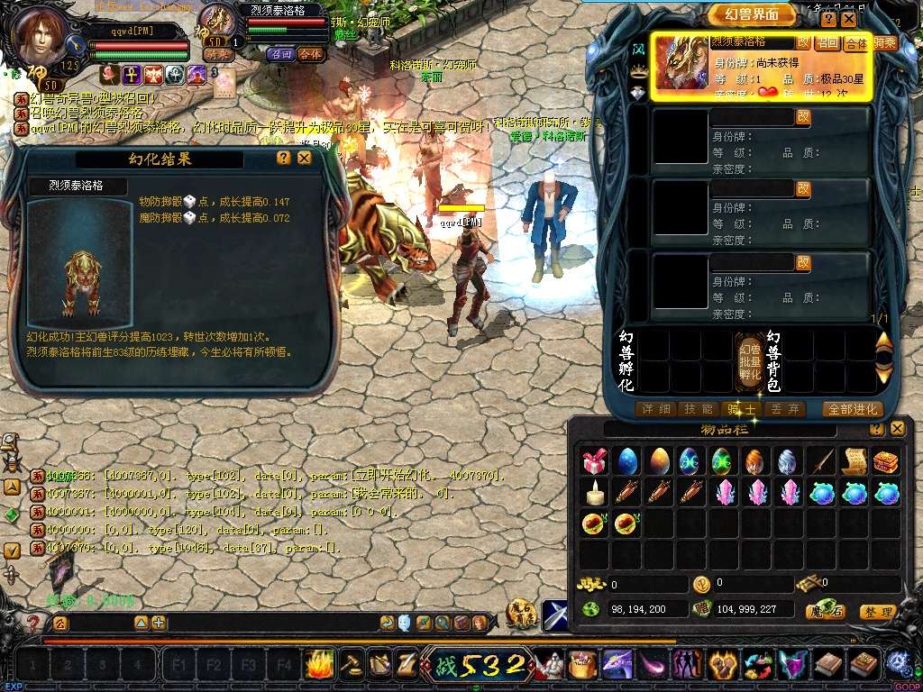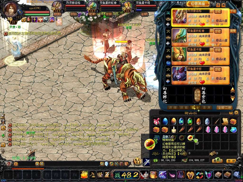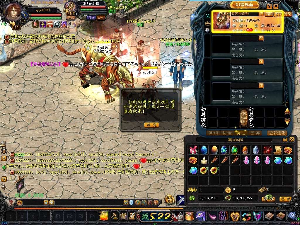 《游戏特色1》地图上所有普通怪物可以爆到神兽结晶,宠物吃了合一下就增加10星。