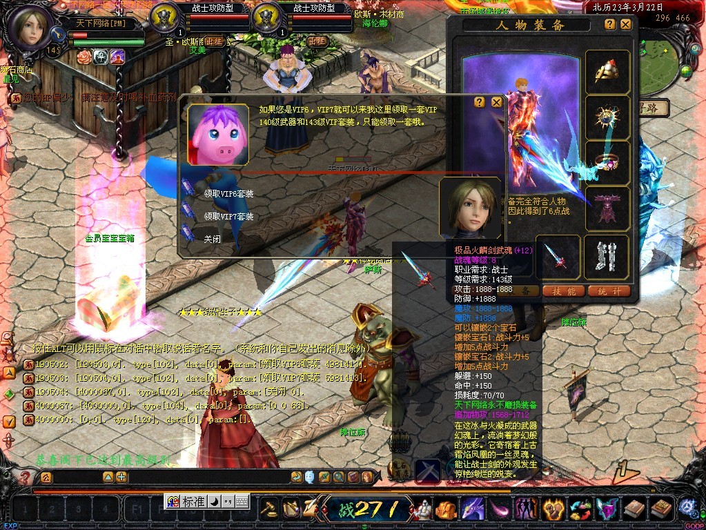 VIP7=30 元: 魔石自动入包300点,等级送到148级,属性加3888,BOSS入包30万,蜘蛛王后入包100万,免费领取143级魔魂+12