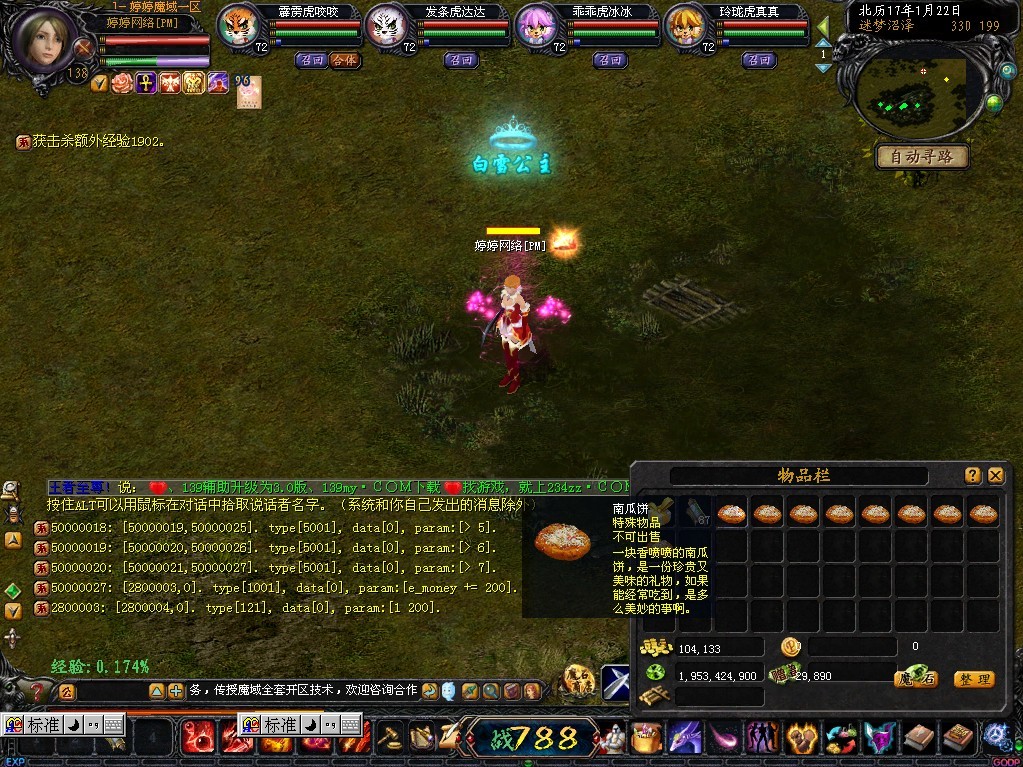 【游戏特色】全怪爆南瓜饼,上交给“悲情法师”有一定机率获得1-5万魔石自动入包,神谕之石等物品