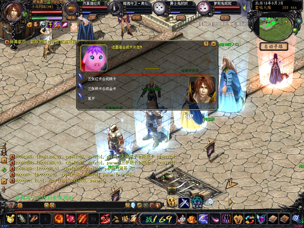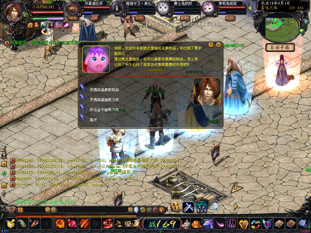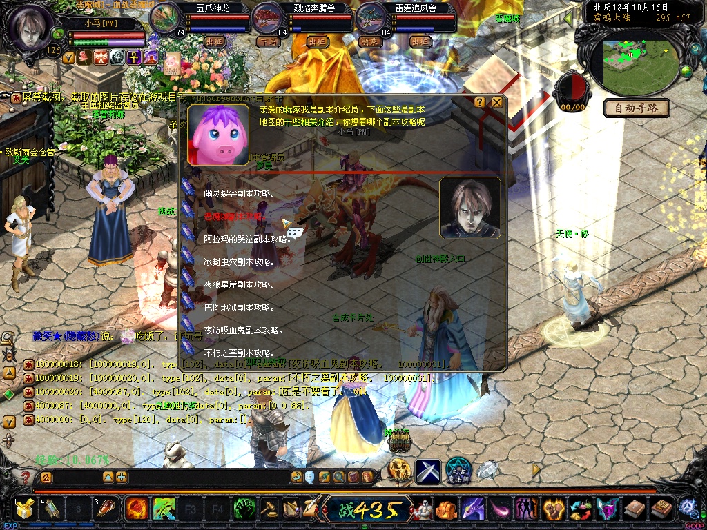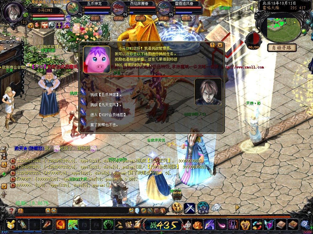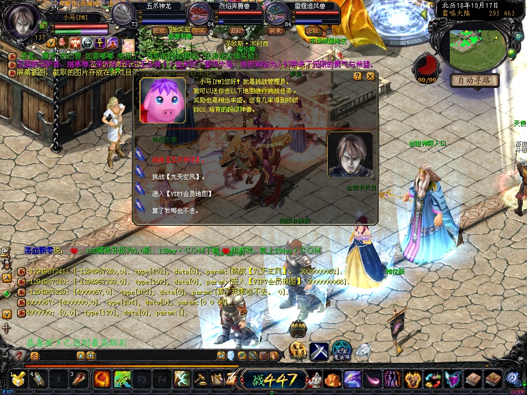 9:加入挑战地图。分别为神兽【九天神龙】--神兽【九天玄凤】。进入地图需要两张好运金卡。有几率爆出神兽修炼的神宠,本服绝版宝宝。几不可失哦!