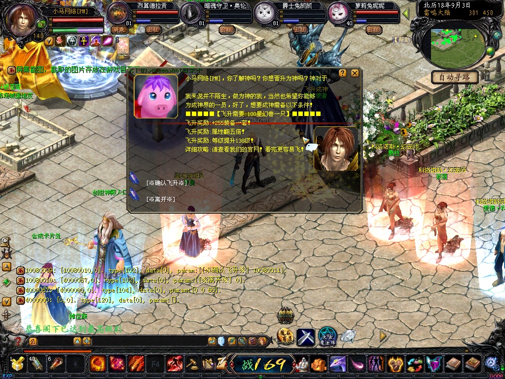 4: 加入飞升成神任务,只要你身上有1只100星的宝宝一只,即可进入飞升成神挑战,奖励等级,加255终极装备一套!