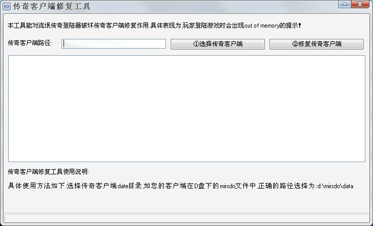 传奇私服客户端修复工具能对流氓传奇登陆器破坏传奇客户端修复作用.具体表现为,玩家登陆游戏时会出现out of memory的提示!