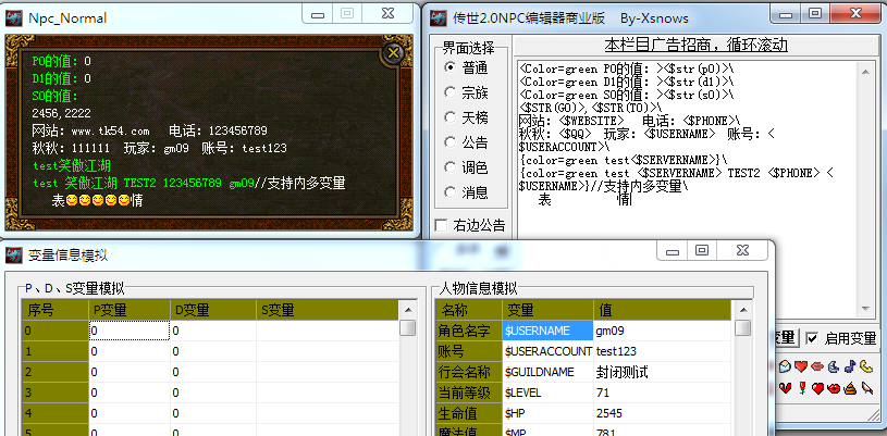 1.增加$USERNAME,$LEVEL,$GAMEGOLD等常用变量显示,需在《变量》面板预设