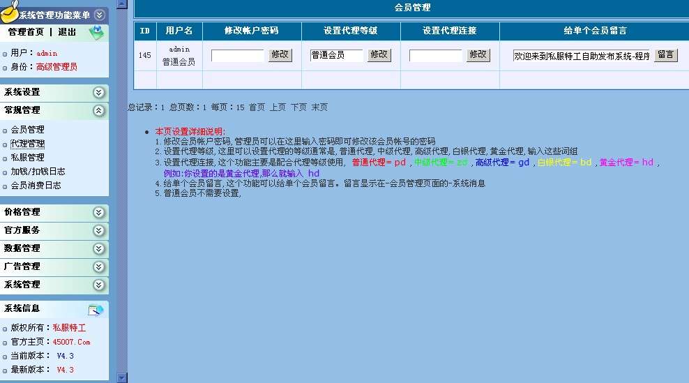 在次声明:以上功能全部开放使用,没有做任何限制,也没有任何限制收费使用,请大家放心使用,你在使用本程序的过程中,我们将终身为你免费提供更新,我们发布新版本在你的后台官方版本号会有所改变,如果你正使用的版本号和官方版本号不同,那么就需要更新,请登陆到我们的网站,www.45007.com 下载更新程序,以及更新日志.