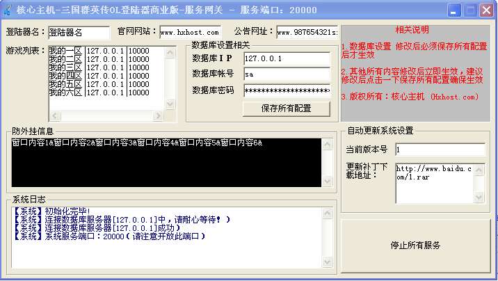注(免费试用登陆器的配置网关的IP和端口只能在配置文件上,商业版无需配置文件,集成在登陆器程序内,别人无法获得你的IP地址。这样就不用担心别人使用其他登陆器登陆游戏了。)