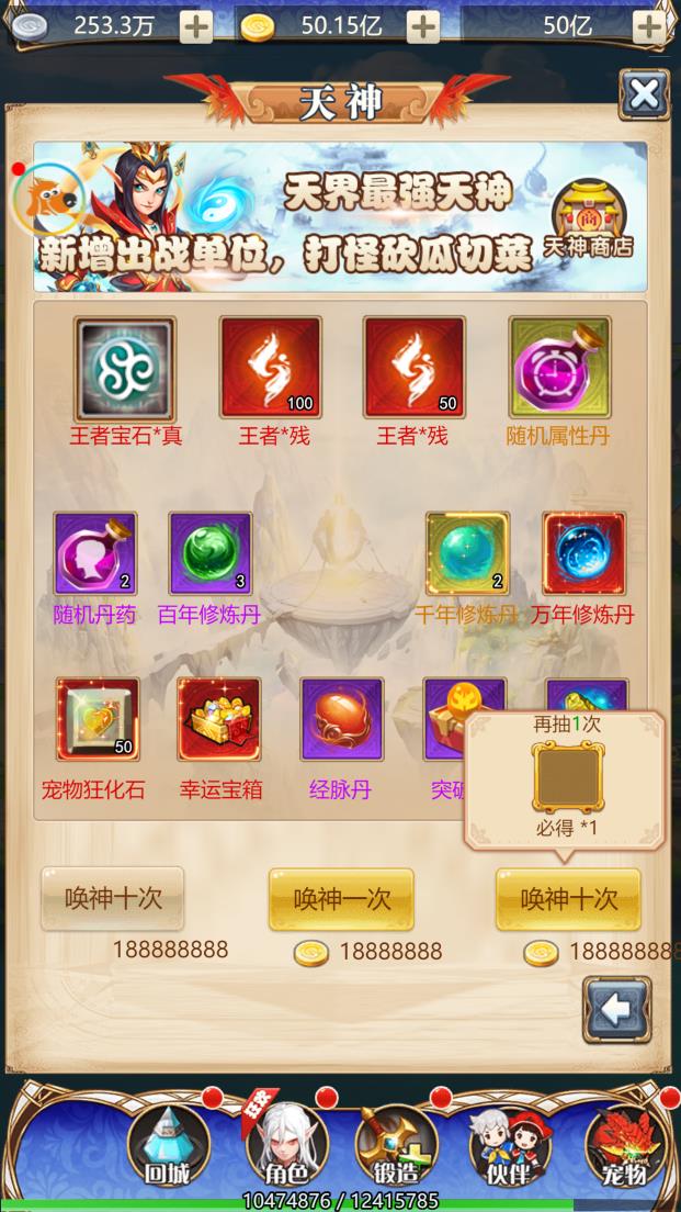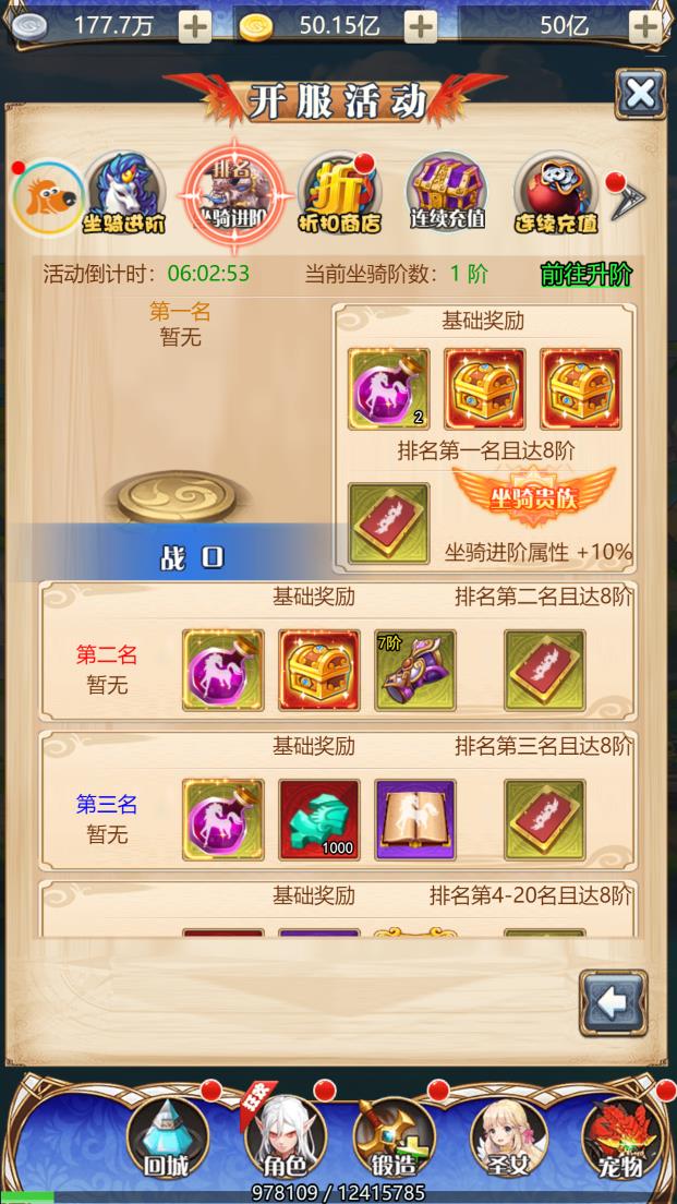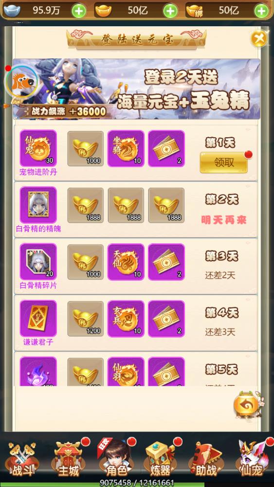 3档:单日充值50000元(实际金额500元):随机进阶丹*2000,神·进阶丹*200,属性丹大礼包*50