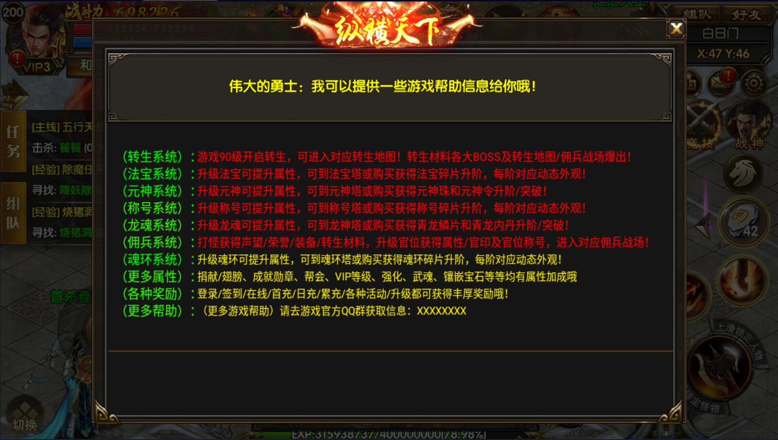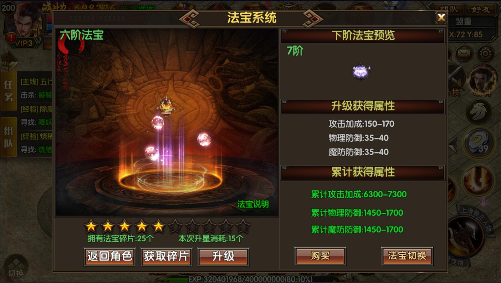 (法宝系统):升级法宝可获得属性加成及酷炫外观、对应法宝装备,法宝材料可充值VIP获取、法宝塔、各大BOSS身上有爆哦!