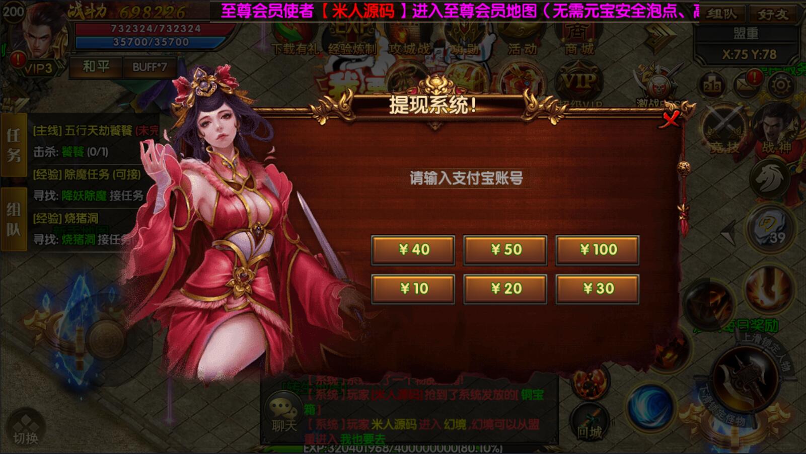 (每日充值):玩家每日充值可在充值返利界面获得丰厚奖励哦!充值1元可获得1张赞助会员卡,可进入赞助地图,爆率超高