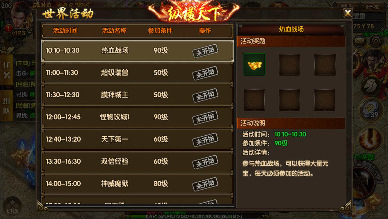 (活动BOSS):(活动期间)每晚18:05土城药店下方108,93会刷新宝石首领,击杀可获得大量宝石和材料哦!