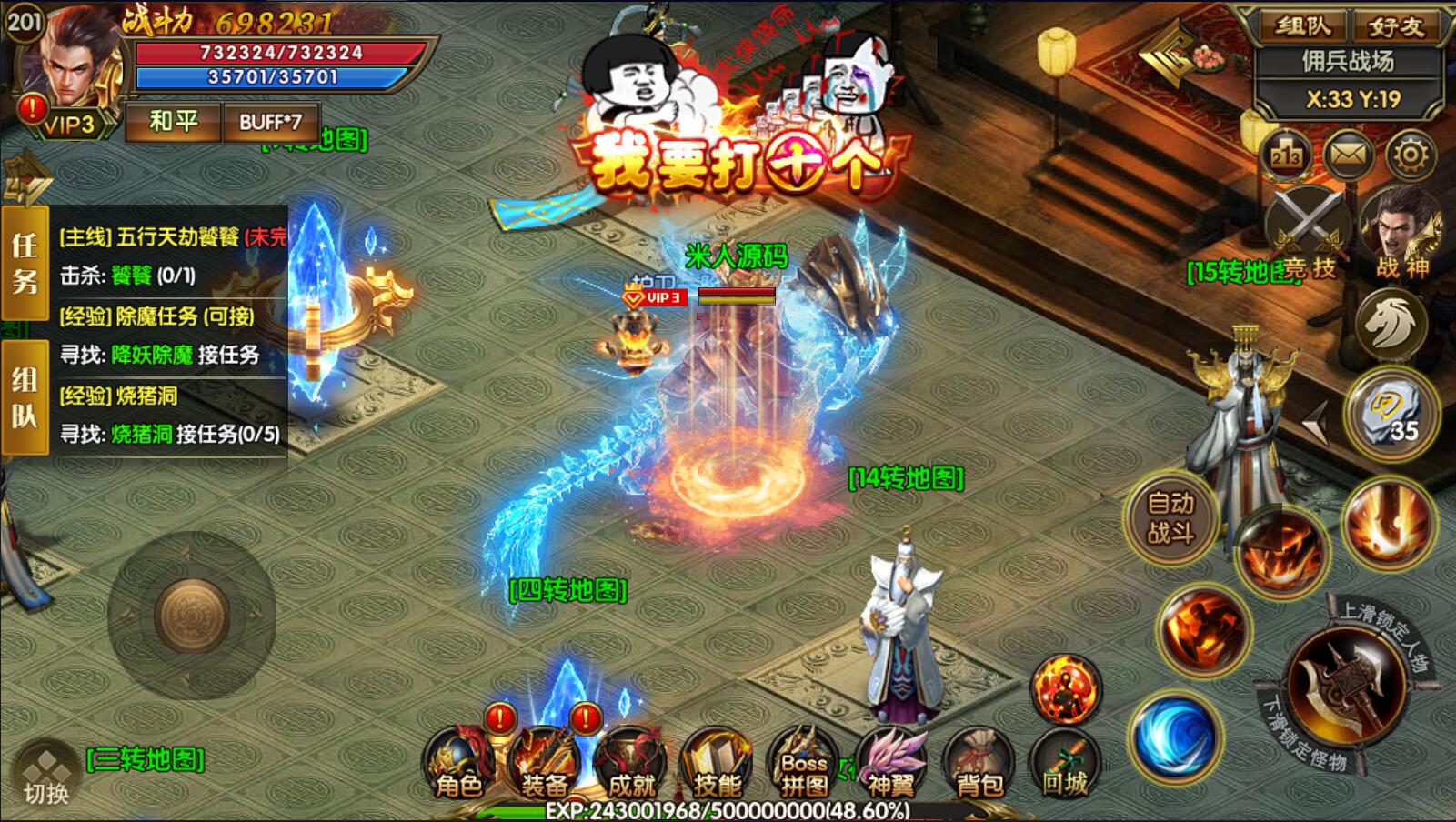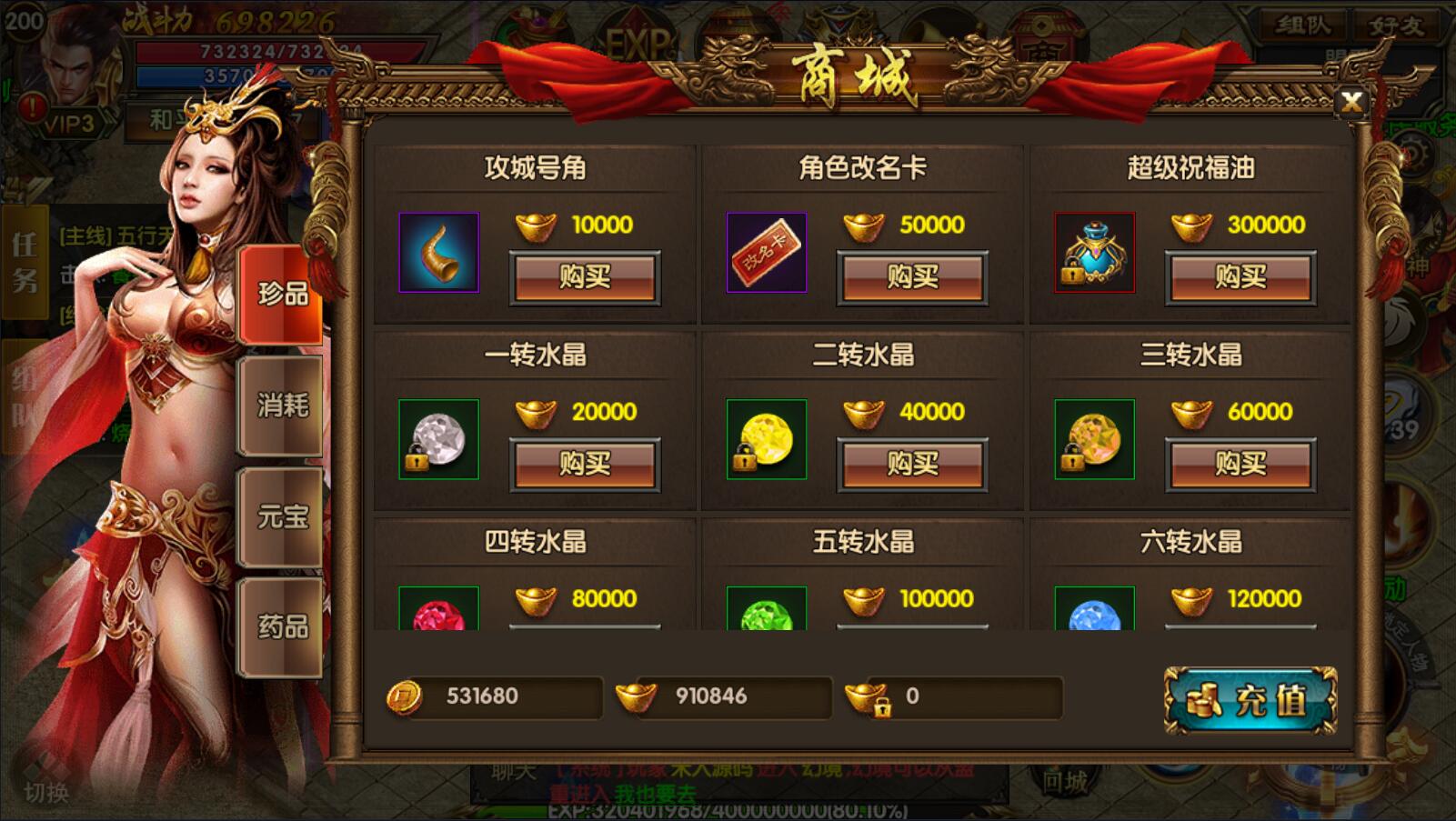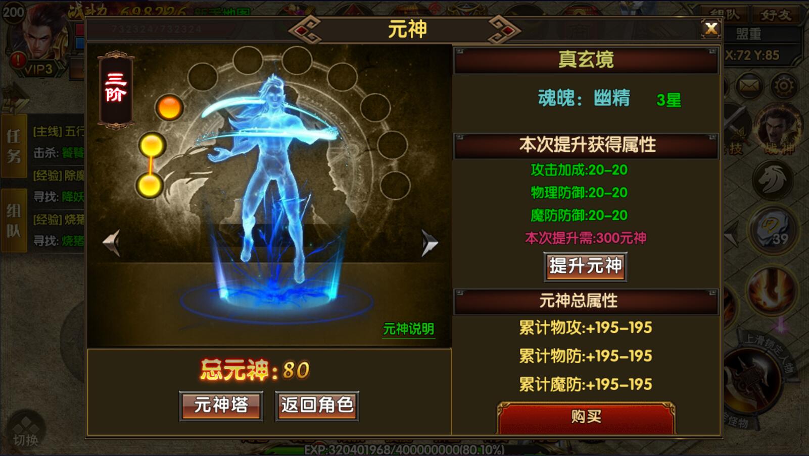 (元神系统):升级元神可获得属性加成,元神材料可充值VIP获取、元神塔、各大BOSS身上都有爆哦!