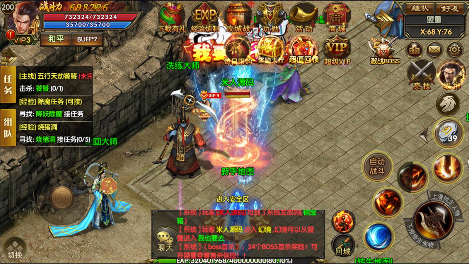 (宝石BOSS):(活动期间)每晚18:05土城药店下方108,93会刷新宝石首领,击杀可获得大量宝石和材料哦!