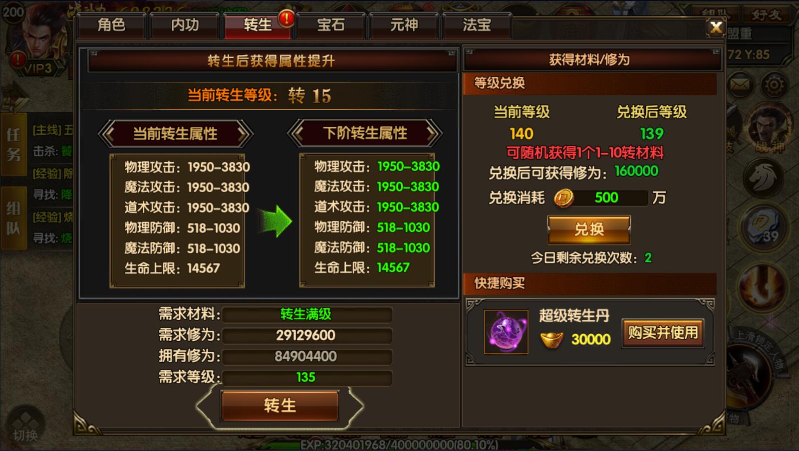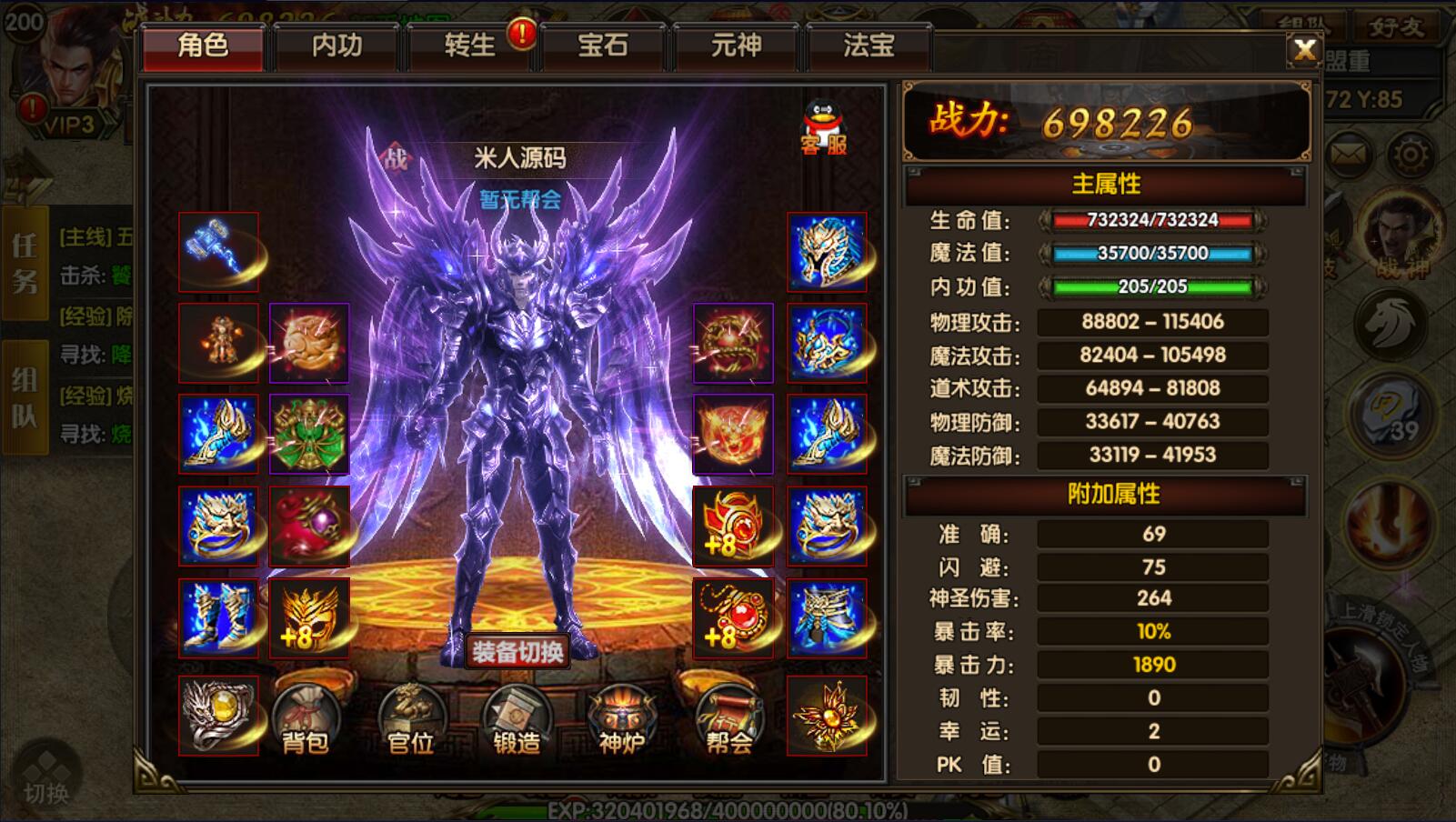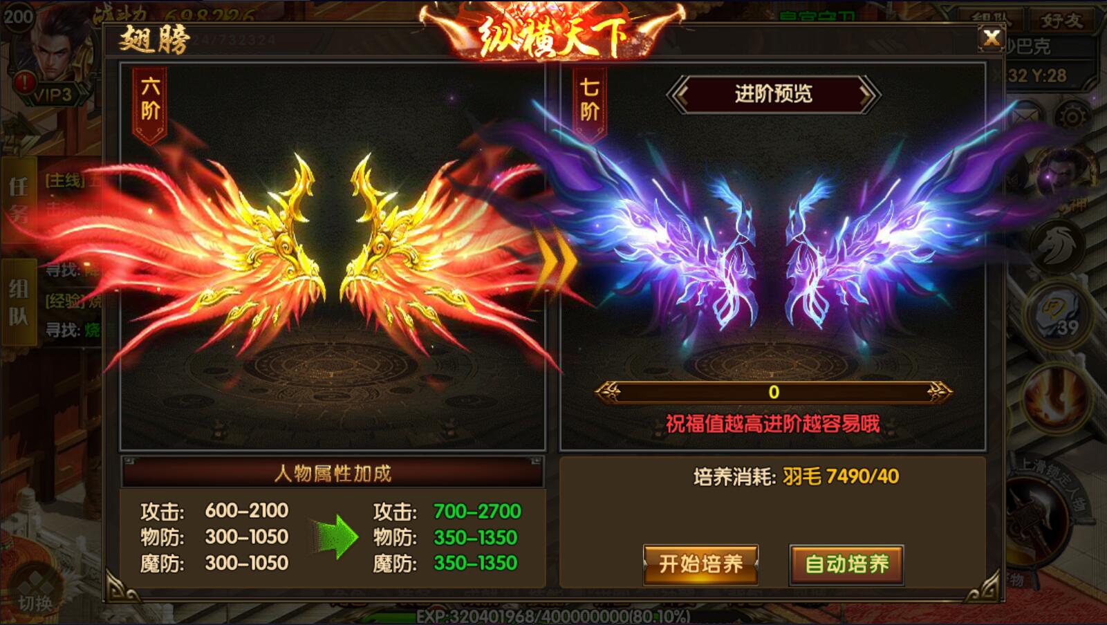 (更多属性):转生、翅膀、成就勋章、帮会、VIP等级、炼魂、武魂、官位、强化装备均有属性加成哦