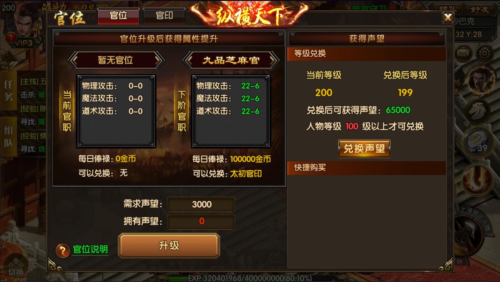 (佣兵战场):打怪获得声望值可升级官位、荣耀值兑换官印、刷满官位可去葬龙谷,爆1-9转装备哦!