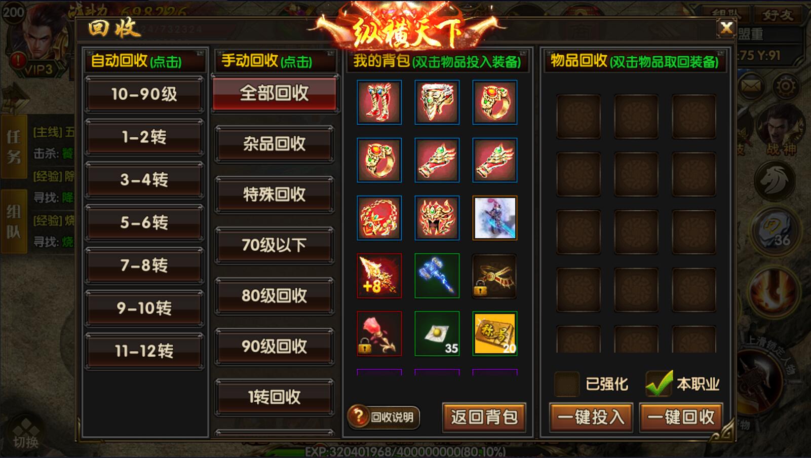 (自动回收):玩家挂机打怪可在回收界面或盟重【自动回收】NPC开启自动回收装备哦!让您自动挂机打宝无忧