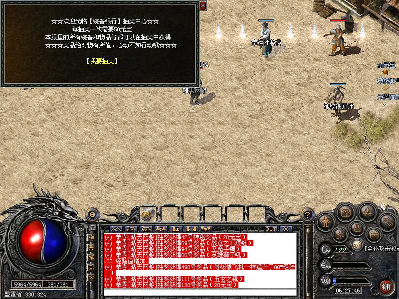 欢迎大家登陆晴天网游,本服务器采用盛大最新版,特增加元宝抽奖活动,有很大机率抽到意想不到的物品!快快行动