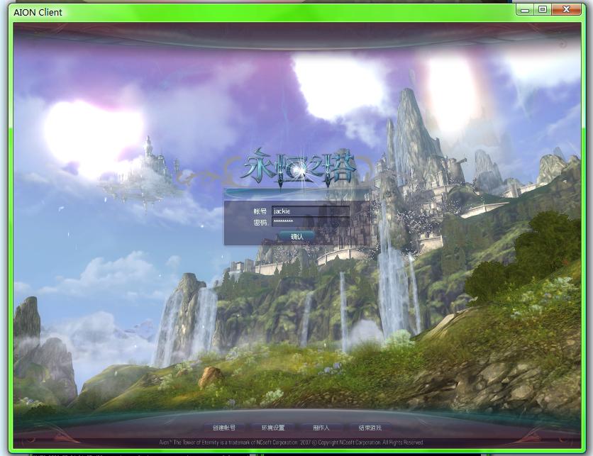 带有客户端补丁将bin32ion.bin -ip:127.0.0.1 -ng 存入一文本文件命名为aion.bat放入客户端根目录下即可 双击.bat启动游戏即可 (注意:帐号密码随便填写。自动注册)