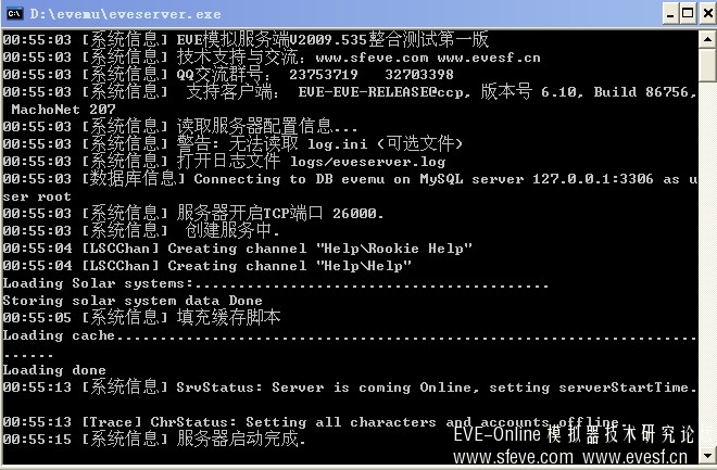 运行EVEMU.exe 控制台程序,启动数据库,启动服务器端程序。