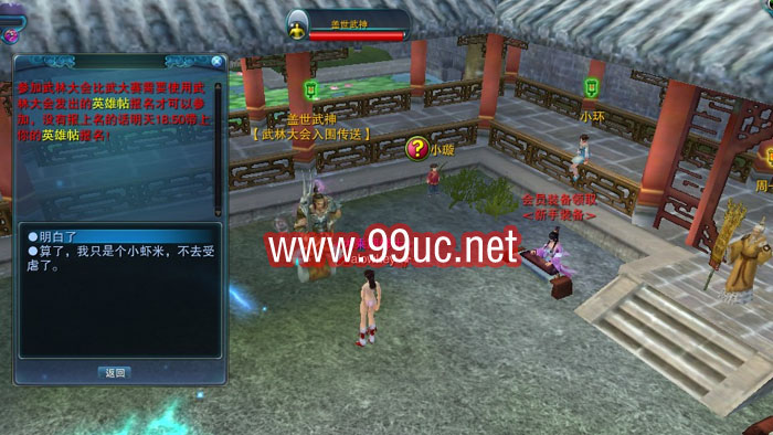 【武林大会】★ 本服独家开发【武林大会PK赛】系统,该活动每天举行一次,报名时间为00:00-18:50。所有玩家均可报名参加,报名所需的【英雄帖】可在河阳【装备兑换】处兑换。PK赛分为【入围赛】、【初选赛】、【晋级赛】、【高手赛】、【巅峰对决赛】五个阶段。每天晚上19:00系统自动刷出【武林大会入围赛传送门】,届时所有已报名的玩家均可前往参赛。入围赛比赛时间为15分钟,入围赛结束后系统自动刷出【武林大会初选赛传送门】,只有在入围赛胜出的玩家有资格传送入场参加初选赛。同样,初选赛结束后,系统会自动开放晋级赛传送门,在初选赛胜出的玩家可继续参加【晋级赛】,以此类推。在最后的【巅峰对决赛】中胜出的玩家,将成为当届的【武林盟主】可以获得超级武器【武林盟主·神器】和 拉风称号【武林至尊】,称号只能保留1天。在晋级赛,高手赛胜出的玩家,同样可以获得鼓励奖。详细比赛规则请进入游戏查阅河阳NPC【武林大会使者】。