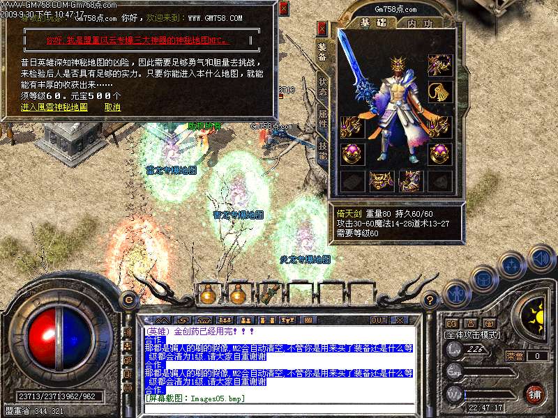 3 加入24万血的通天教主和180万血的吉祥兽,这2种怪会爆出炎龙,雷龙,青龙,疾风,怒血,神合,等一系列的超好装备!(注意:团结就是力量,拿出你们的实力去挑战它们吧!)