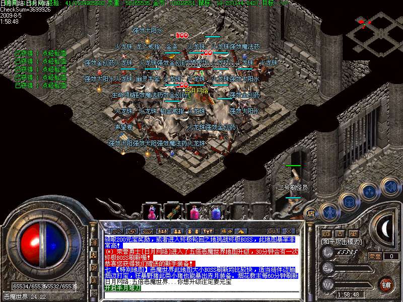 16.【特别地图】恶魔世界此地图大小BOSS刷新均比较快,适当结伴边抽烟边打宝,狂暴野猪此类小猪也能暴出赤月装备。烟花教主每60分钟刷新