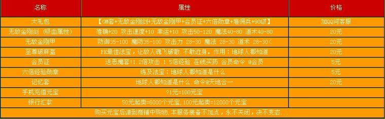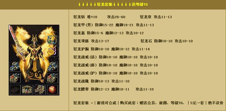 二:去掉赤月套装等以下的垃圾爆出(保留个别地图爆为了给大家打了换声望) 三:当你累计了一定数量的装备后可合成更高一级的装备,比如3只(雷霆战戒)可以合成(雷霆战戒①),合到第九次为(<终极>),这种玩法可以让你玩上一两年也不会烦腻。赤月套装、怒斩、龙牙、逍遥扇、麻痹、护身、复活都可以合成。