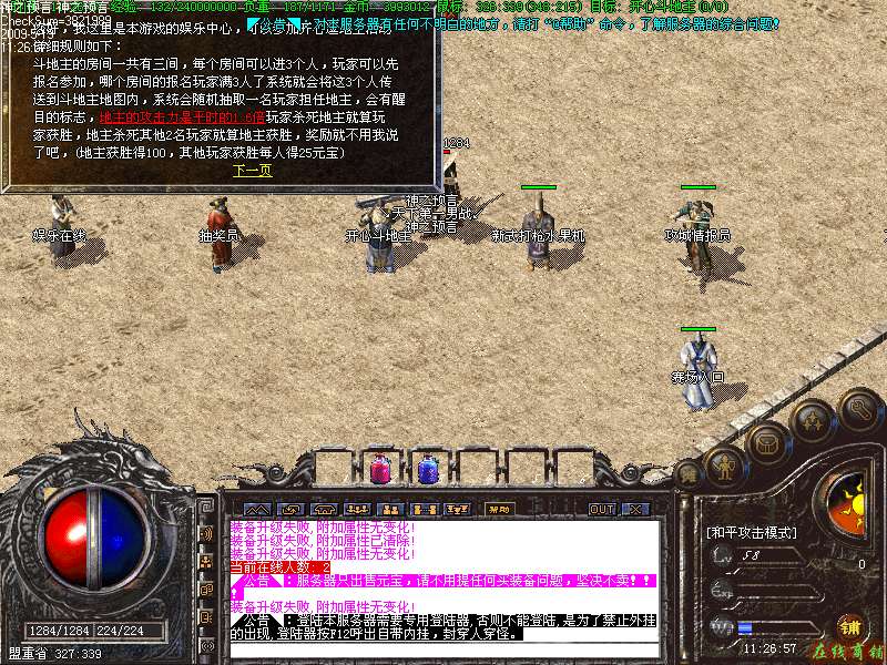 4:?开心斗地主系统,玩家可以通过开心斗地主赌博的方式进行PK,地图内每次进入3个人然后会随机选取一位当地主,地主的攻击力是平时的1.6倍,其他2位玩家正常,比赛的方式就是2v1哪方胜利哪方便可以得到对方的元宝,等级限制是5级以内