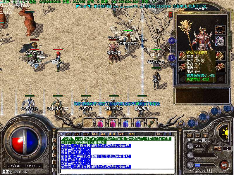 【游戏特色】灵魂属性.行会徽章.等级传送.冲级大奖.抢庄赌博.装备回收.装备拍卖.声望功能。