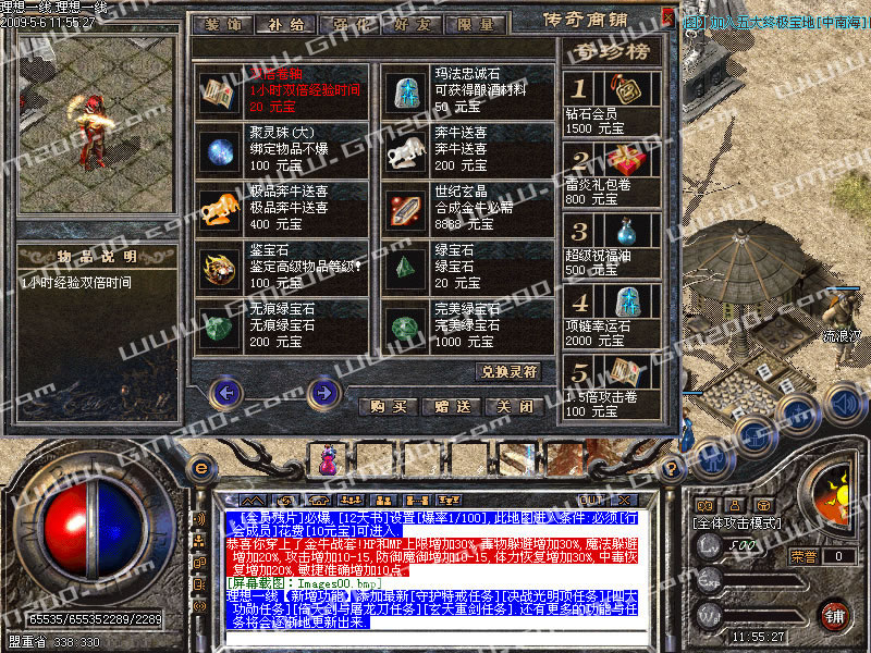 【会员功能】命令:[@会员服务]1.每天领取200元宝+300W经验 2.拥有3大专用的升内功地图 3.拥有独特的会员7彩转身功能 4.拥有会员打宝地图 5.只需1元宝清理1000点PK值 6.人物英雄转性转职服务 7.在线购物系统!