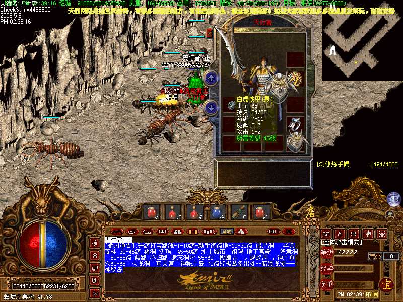有了45级之后,组队去蝴蝶谷,火龙洞,不归路,水上城市,蚂蚁洞等等各地图打点45,49,52的装备(注意,最好是法师和道士一起配合打点初级装备,法师最好不要一个人单独行动,因为刚出身的法师打怪还有点困难,呵呵),有了52级装备了之后,就可以开始慢慢打55,58级装备,55,58的装备爆率在真天宫的8800滴血的怪上爆,爆率就中等。