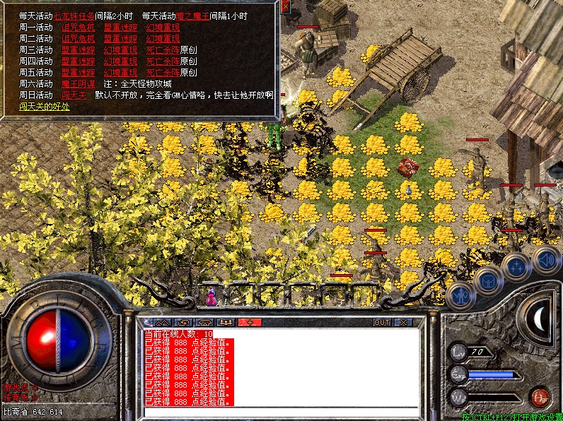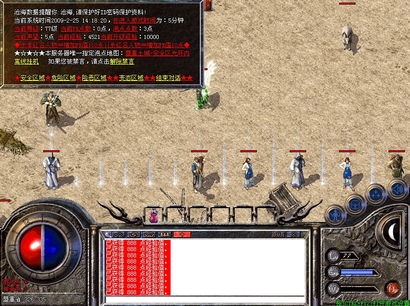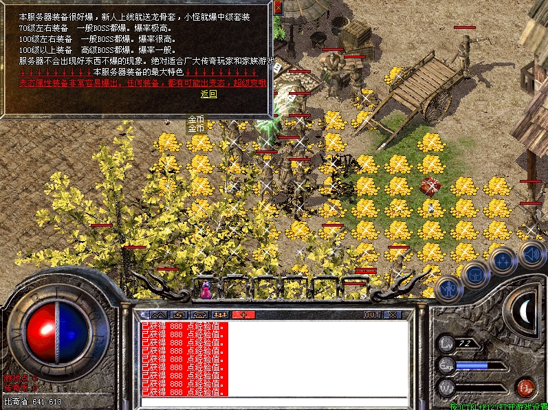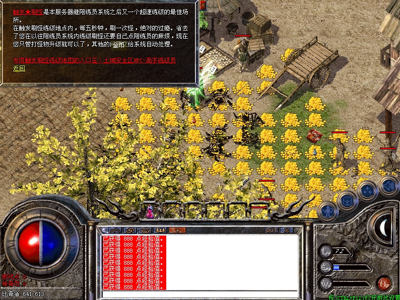 二:本服务端即陪练员系统之后,又开发了一套全新的练级模式:自动刷怪练级厅.在练级厅里不需要手动刷怪了,每搁3秒钟,大厅里就自动刷出怪物让你打.只要你站在大厅里,就会不断有怪物刷出来.进入地点,土城安全区找-高手练级员!服务器打怪经验为盛大的一万倍,爆率为100倍!