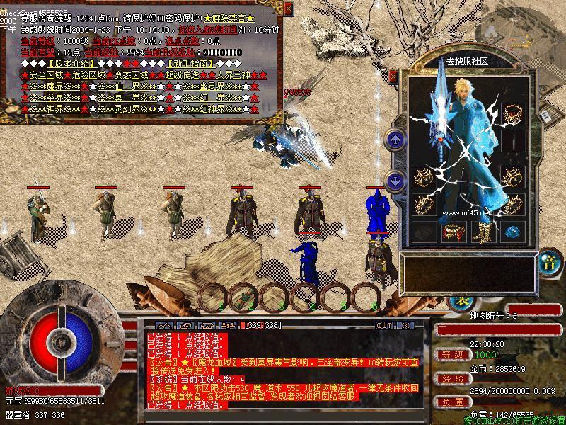 新手出来练点级别就可以直接去打白野猪1/2爆金条,1/10爆金砖,顺便去变态区域打些天地,天龙装备,天之结界爆天地,天龙,合成宝石,(土城装备合成师可合成所有装备)然后去桃园三层或魔界血窟一层二层打火龙,金陵装备,元宝,经验卷,真武器(一把真武器可换50W经验)打上两个小时几乎个个都有火龙,金陵装备装备.然后找几个人组队去魔界亡陵(暴金陵装备 龙吟传送卷)或魔界境地的花果山和水涟洞暴龙吟,绝世装备(花果山和水涟洞的怪超猛,必须各职业配合着打,法师卡好位置,战士引怪,道士下毒如果有无敌霸王盾法师打的就快多了)只要肯打三天时间,就三天个个好装备.本服在土城装备合成师那两件低等级装备既可合成高等级装备,最高可合成终级装备(两件绝世装备既可合成至尊装备),第一天比较难一定要努力坚持,只要有金陵,龙吟装备先给法师和道士带武士专门拣装备,引怪,清人就OK了.有时间可以去魔界地图打超属性装备,属性超强,具体查看魔界装备导行。等有了半套绝世装备法师,道士,战士组队就可以去幽灵界打终极装备,九幽森林爆65至尊装备爆率高,九幽绝境爆70级魔幻装备爆率低,九幽圣地杀死九幽宫主必爆至尊魔幻装备。圣界爆75级圣灵装备,圣战武器衣服任务物品,冥界爆冥界超属性装备任务物品,关于练级:练级最快的方法就是去圣地1.2.3层打真武器一把真武器可去土城换取50万经,也可去桃园三层或魔界血窟二层打经验卷或带真的武器,去回收站换经验!本站开通了合成系统,可合成终级装备.