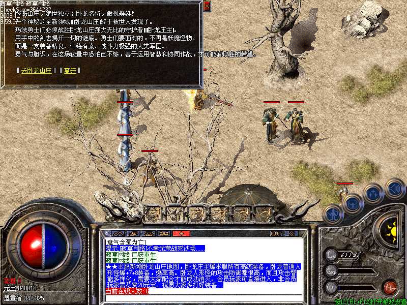 ★★本服新增卧龙山庄地图,卧龙庄主爆本服所有高级装备,卧龙普通人形怪爆+7+8装备,爆率高。卧龙人形怪的攻击防御都很高,而且攻击智能多样化,需要大家配合才能成功消灭。会员玩家可直接进入,非会员玩家需花费20元宝。祝愿大家多打好装备....